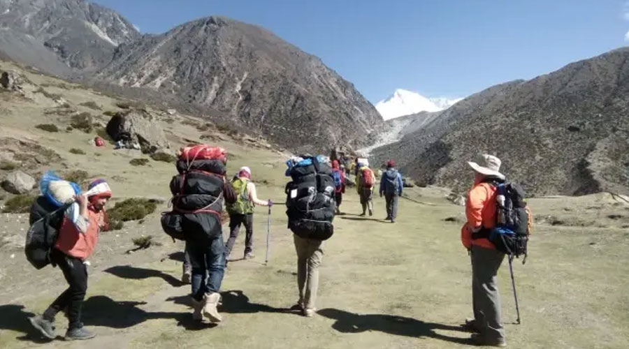 Trekkers heading towards Everest base camp in groups